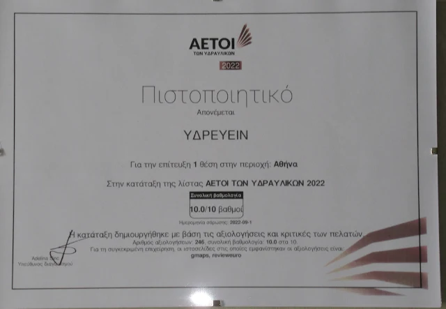 Υδραυλικος Αθήνα ΥΔΡΕΥΕΙΝ  πρώτη θέση για το 2022 στον διαγωνισμό αετοί των υδραυλικών www.υδρευειν.ελ 2117702013
